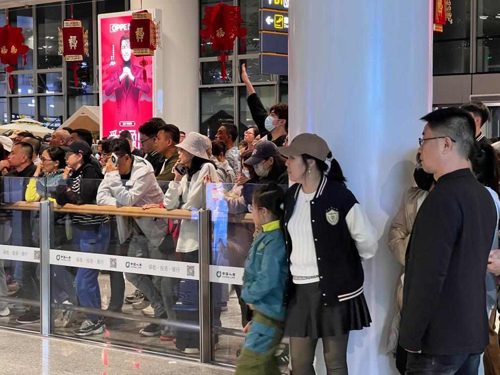 农历大年三十凌晨,人们在海口美兰国际机场等待家人朋友。