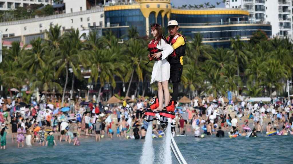 在海南省儋州市海花岛旅游度假区,摩托艇、水上飞人、动力伞、高空跳伞等项目吸引了大批游客。游客坐在沙滩集市吃美食喝椰汁,欢声笑语不断。