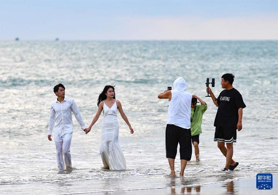 游客在三亚大东海景区游玩(12月15日摄)。