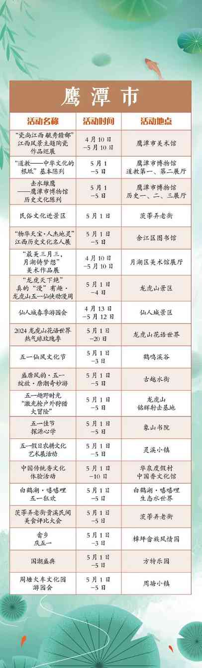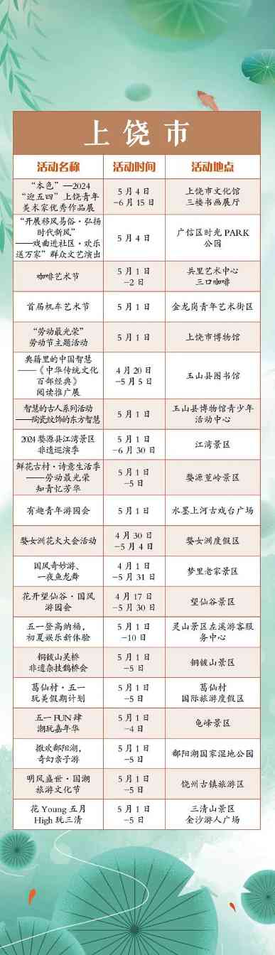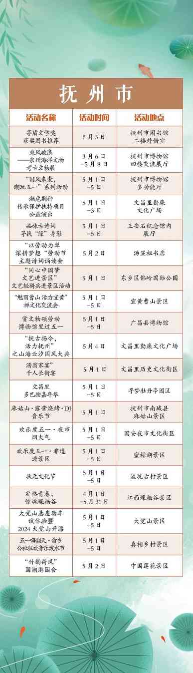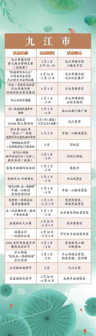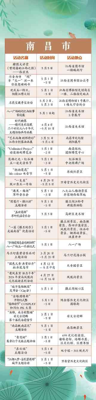 搓一淘趣闻“五一”小长假,江西全省共将举办1300余项文旅活动。涵盖公共文化、文化演出、展览展演、惠民活动等多个方面。假期出门便可享用“文旅大餐”,总有一款适合你,一起来看看吧!“五一”小长假,江西全省共将举办1300余项文旅活动。涵盖公共文化、文化演出、展览展演、惠民活动等多个方面。假期出门便可享用“文旅大餐”,总有一款适合你,一起来看看吧!