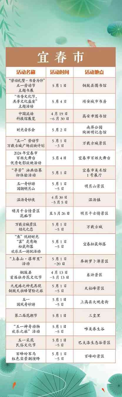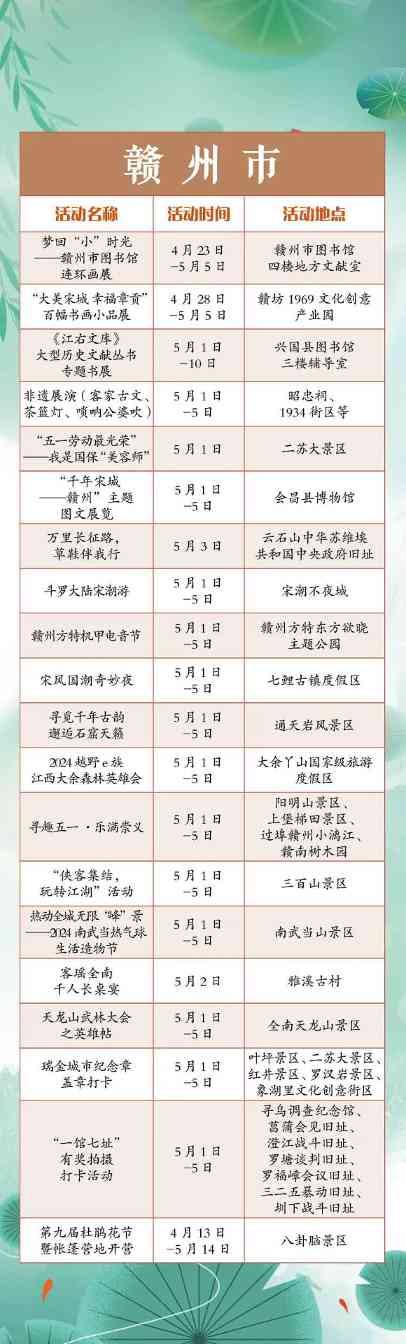 “五一”小长假,江西全省共将举办1300余项文旅活动。涵盖公共文化、文化演出、展览展演、惠民活动等多个方面。假期出门便可享用“文旅大餐”,总有一款适合你,一起来看看吧!“五一”小长假,江西全省共将举办1300余项文旅活动。涵盖公共文化、文化演出、展览展演、惠民活动等多个方面。假期出门便可享用“文旅大餐”,总有一款适合你,一起来看看吧!