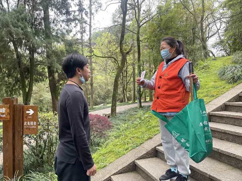 保洁员持“禁烟卡”劝阻不文明吸烟行为。图片来源:南平市文化和旅游局