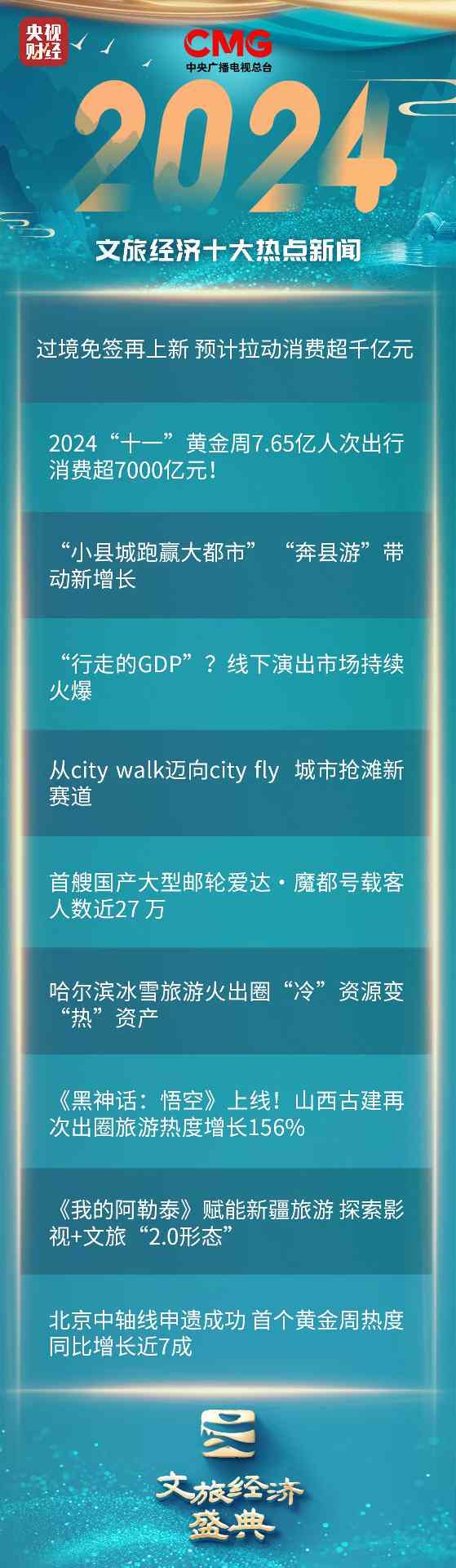 2024年5月,习近平总书记在全国旅游发展大会上提出“着力完善现代旅游业体系,加快建设旅游强国”“推动旅游业高质量发展行稳致远”等一系列重要指示精神。随着中国旅游业发展驶入快车道,各地各部门积极推进文化和旅游深度融合发展,不断探索“旅游+”“+旅游”等创新模式,打造出诸多文旅亮点和消费热点,不断刷新地方文旅经济成绩单的同时,更为百姓提供了满足美好生活需求的丰富载体。为全面展示文旅发展成果,呈现文旅创新实践,激活文旅新质力量,总台财经节目中心特别策划“文旅经济盛典”,通过覆盖线上线下的地域文旅立体赋能系列活动,践行“以文塑旅,以旅彰文”理念,助力旅游业更好地服务美好生活,促进经济发展,构筑精神家园,展示中国形象,增进文明互鉴。