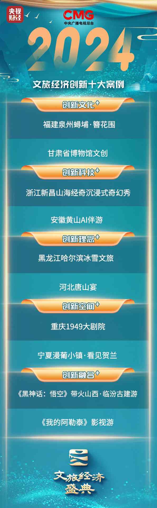 “十大文旅经济创新案例”发布环节,专家委员会在全国100个文旅案例中,选出十个代表性案例,分别为:代表“创新文化+”的福建泉州蟳埔·簪花围、甘肃省博物馆文创;代表“创新科技+”的浙江新昌山海经奇沉浸式奇幻秀、安徽黄山AI伴游;代表“创新理念+”的黑龙江哈尔滨冰雪文旅、河北唐山宴;代表“创新空间+”的宁夏漫葡小镇·看见贺兰、重庆1949大剧院;代表“创新融合+”的《我的阿勒泰》影视游、《黑神话:悟空》带火山西·临汾古建游。