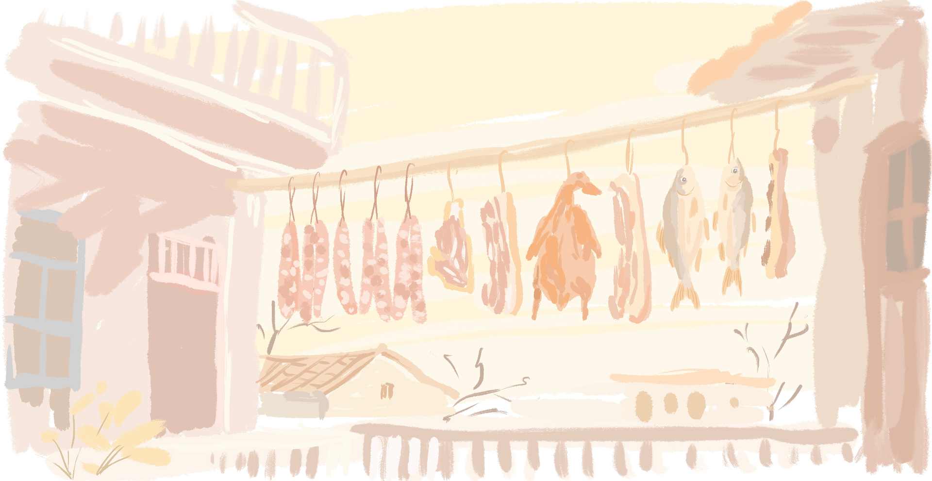 对腊味有执念的广东人根本等不及到腊月,一入冬,腊味就要开整。广东的冬日,干燥、风小、虫少、雨稀,太适合挂肉晾晒了。在中山、东莞、韶关、清远等地,入冬后,人们在阳台、屋檐、院落悬挂腊肠、腊肉、腊鱼、腊鸭等腊味,宛若一串串独特的风铃,成了冬日里特有的风景。冬日的广东,阳光不太暴烈,却是暖融融的。北风呢,也不会太凛冽,是干爽的。在这样的季节气候里晾晒腊味,极其需要耐心,一日复一日地守着,看它们那本是鲜嫩肥腴的肉身,在时光的魔术里被一点一点逼出多余的水分,逐渐变得厚实紧致,成为时间与自然相糅合的极致风味。