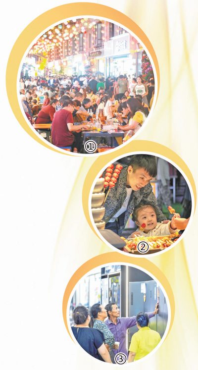 图①:游客在云南省红河哈尼族彝族自治州建水县紫陶街品尝美食。图②:重庆市南川区,游客在夜市摊位前购买美食。图③:江西省宜春市袁州区,以旧换新活动吸引市民选购冰箱。